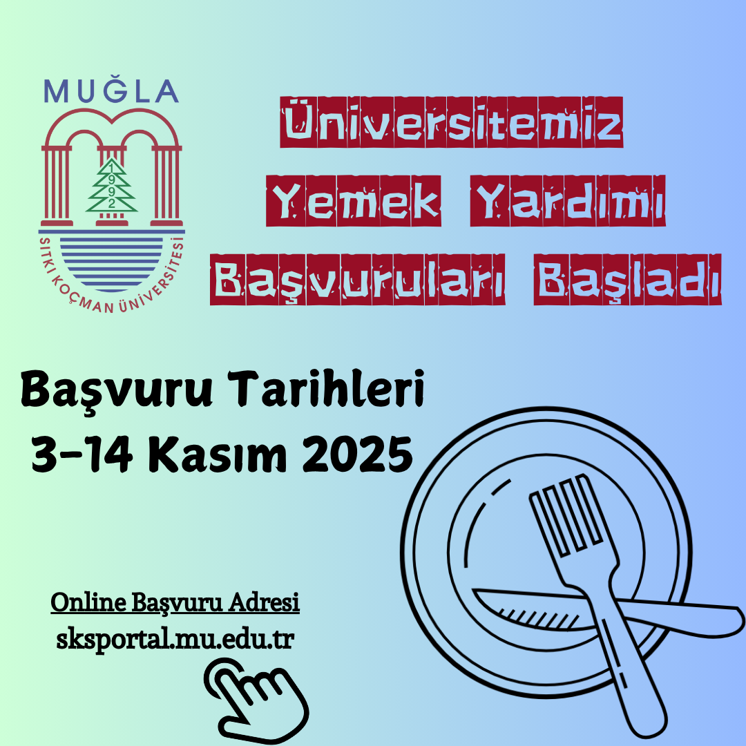 2547 Sayılı Kanunun 46. Maddesi ile Muğla Sıtkı Koçman Üniversitesi Yemek Yardımı Verilmesine Dair Yönergesi doğrultusunda Üniversitemize kayıtlı, başarılı ve maddi imkanları yeterli olmayan öğrencilere 2025-2026 Eğitim-Öğretim Yılı süresince yemek yardımı verilecektir. Yemek yardımı başvuruları öğrenciler tarafından SKS PORTAL üzerinden öğrenim görmekte olduğu birimlere yapılacaktır.  Yabancı Diller Yüksekokulunda öğrenim görmekte olan öğrenciler başvurularını kazandıkları lisans-ön lisans programlarına yapacaklardır.